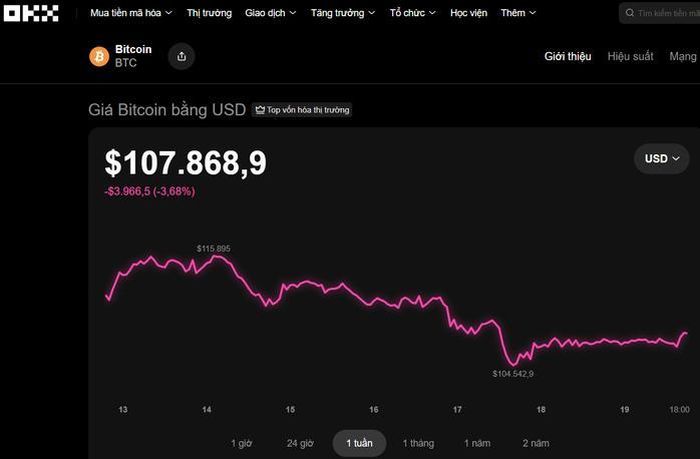 Tối 19-10, thị trường tiền số ghi nhận diễn biến trái chiều. Theo dữ liệu từ sàn OKX, trong 24 giờqua, Bitcoin (BTC) tăng nhẹ gần 0,8%, lên 107.800 USD, nhưng vẫn giảm gần 4% trong một tuần qua.